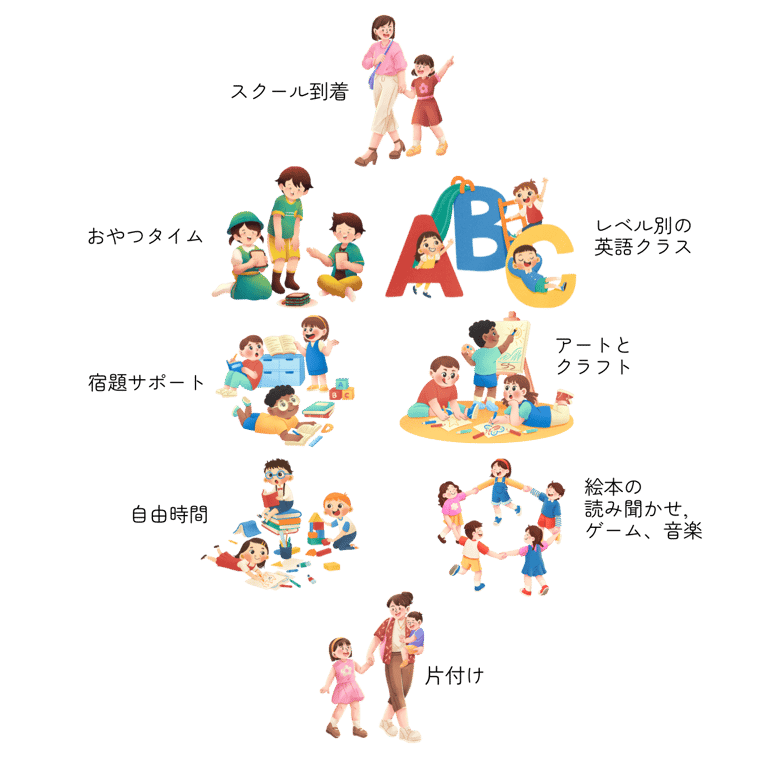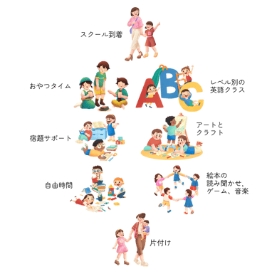 お子様は放課後6:30PMまでフォレストアカデミーに滞在いただけます(お子様の到着から3時間)。アクティビティは、歌、ゲーム、アート&クラフト、絵本の読み聞かせ、本の読み聞かせ、宿題、おやつ・軽食の時間です。おやつタイムの前に、講師から学校の宿題をするように声かけをいたします。